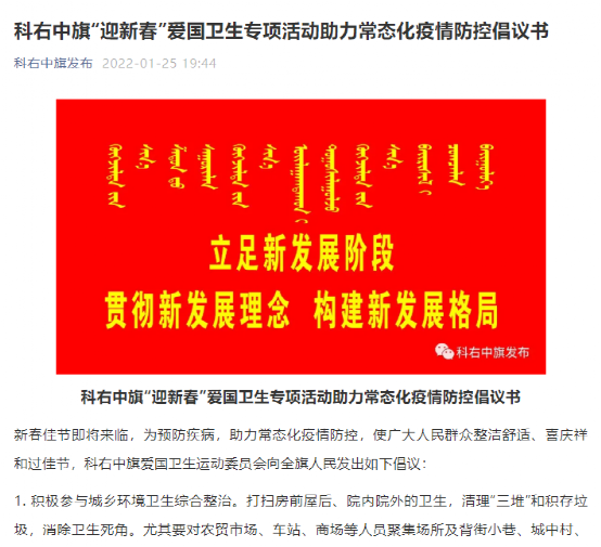 科右中旗爱国卫生办公室,按照盟爱卫办转发自治区《关于开展“迎新春”爱国卫生专项活动助力常态化疫情防控的通知》要求,结合我旗实际情况,制定了《关于开展“迎新春”爱国卫生专项活动助力常态化疫情防控的通知》下发到各个部门,进一步营造干净整洁、健康欢乐有序节日的良好社会氛围,巩固常态化鼠疫和新冠疫情防控成果。