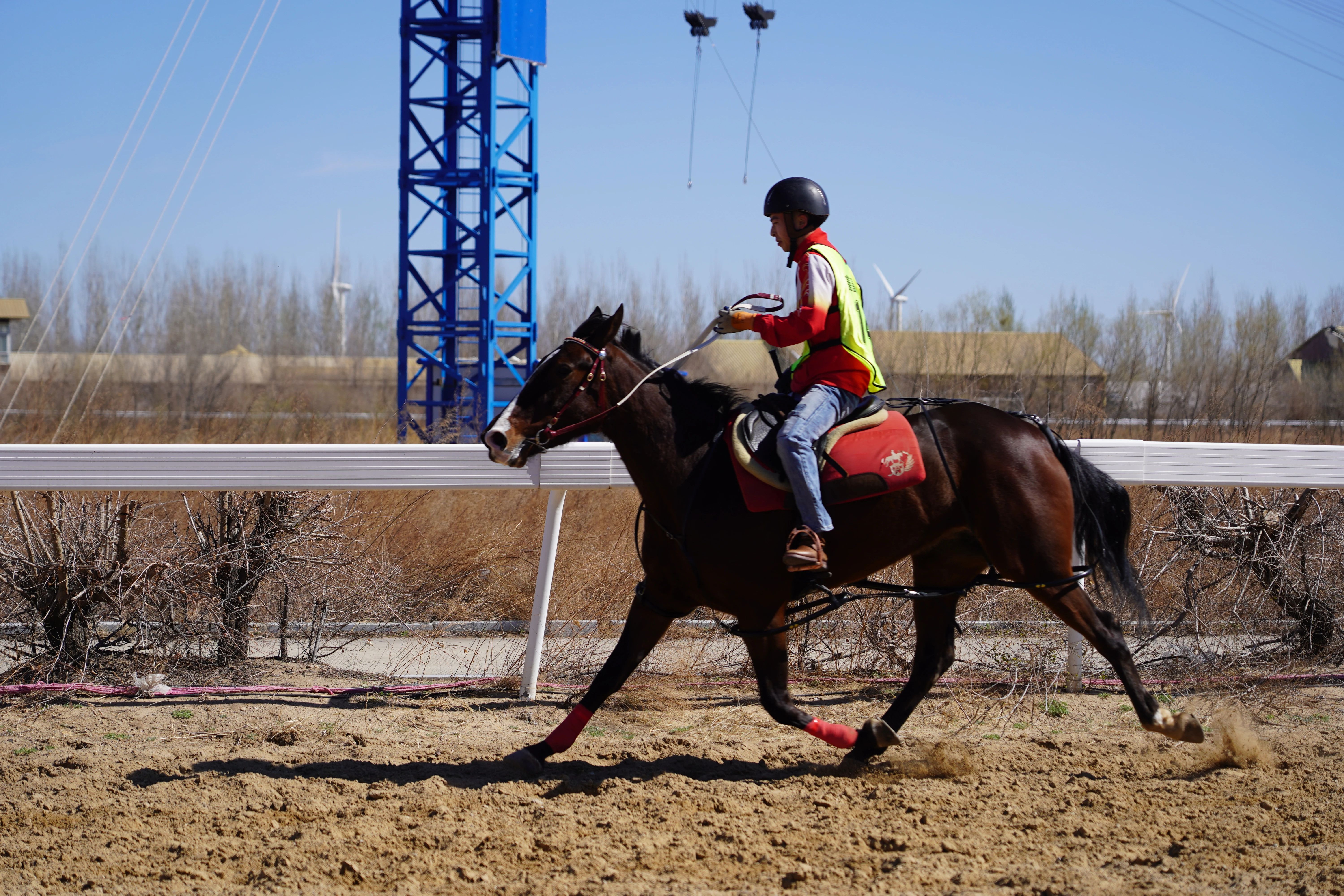 骑手策马扬鞭、奋力疾驰。