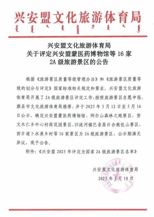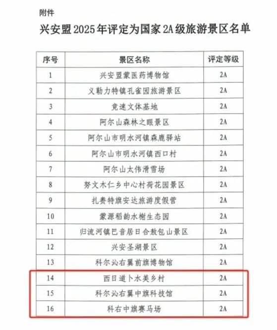 近日,兴安盟文化旅游体育局下发《关于评定兴安盟蒙医药博物馆等16家2A级旅游景区的公告》文件,科右中旗西日道卜水美乡村、科尔沁右翼中旗科技馆、科右中旗赛马场正式被评定为 AA 级旅游景区。