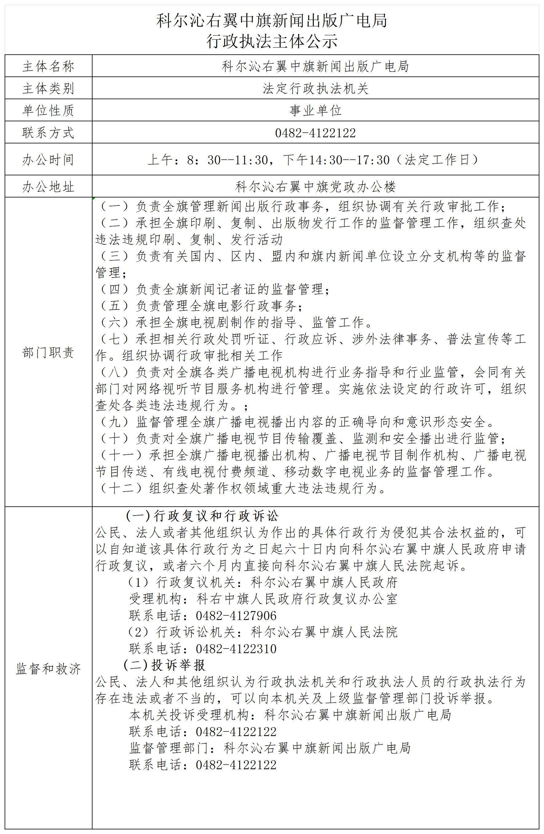 科尔沁右翼中旗新闻出版广电局行政执法主体公示