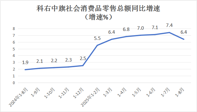 1-8月份,科右中旗社会消费品零售总额7.70亿元,同比增长6.4%,增速排名全盟第6位(全盟增速8.2%)。