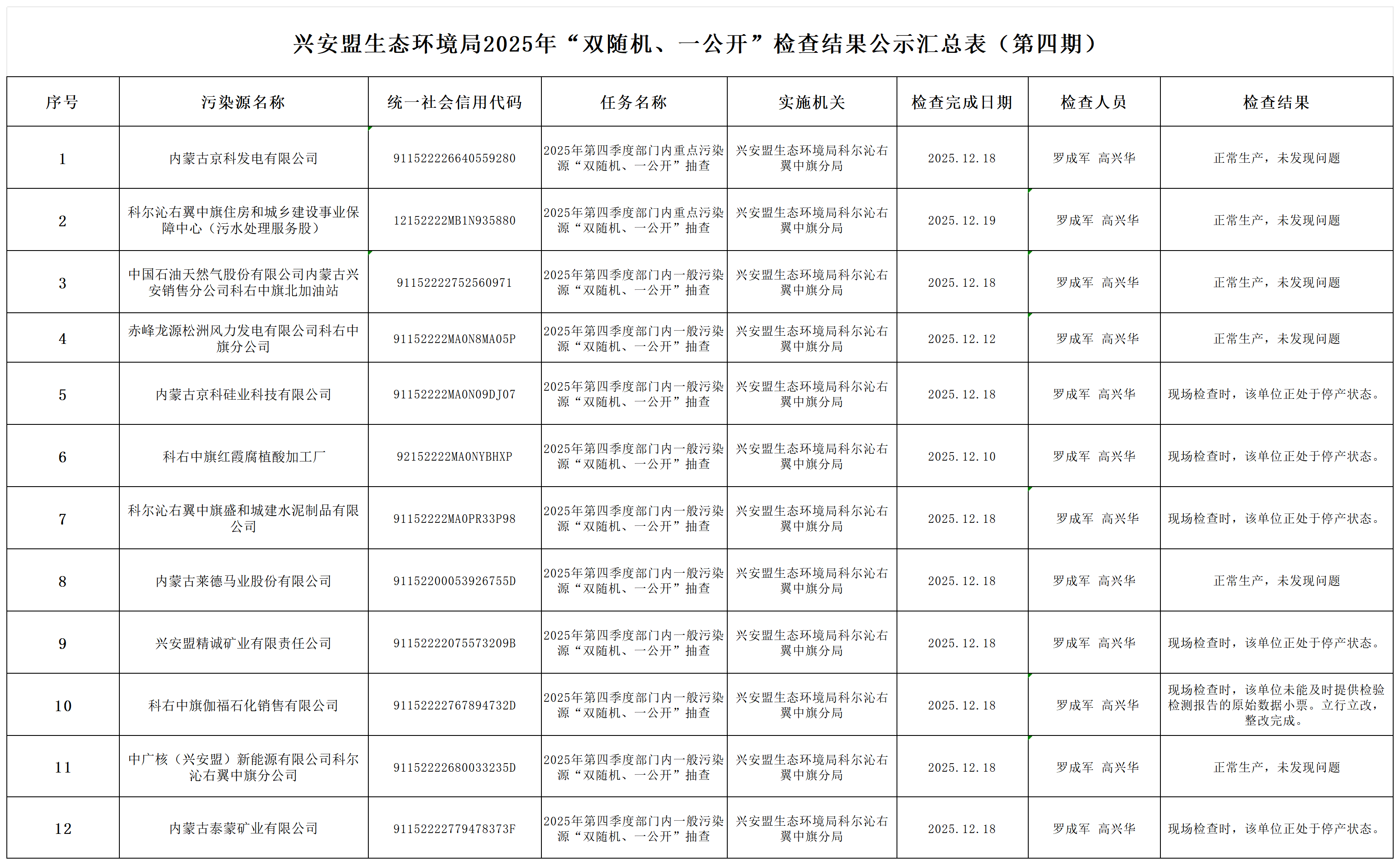 兴安盟生态环境局2025年“双随机、一公开”检查结果公示汇总表(第四期)