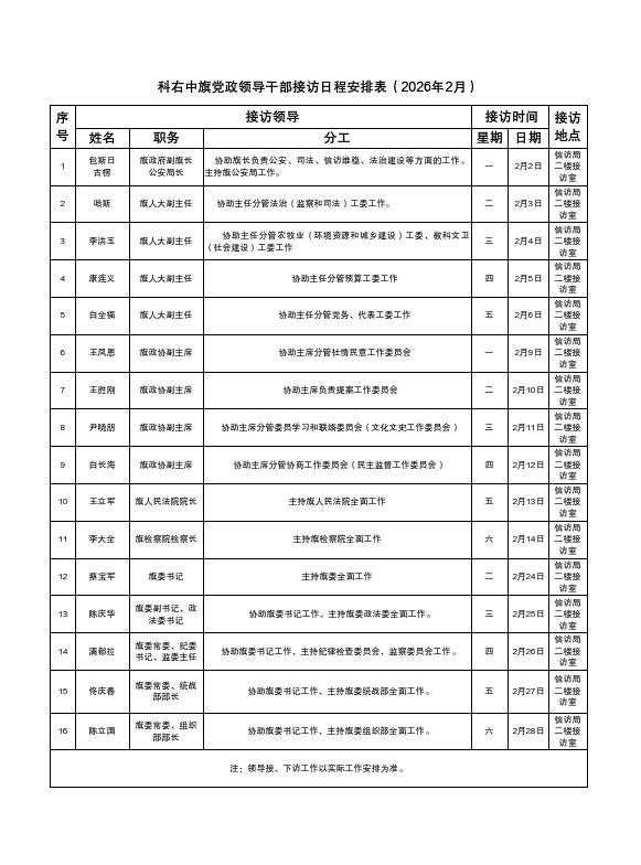 科右中旗党政领导干部接下访日程安排表(2026年2月)