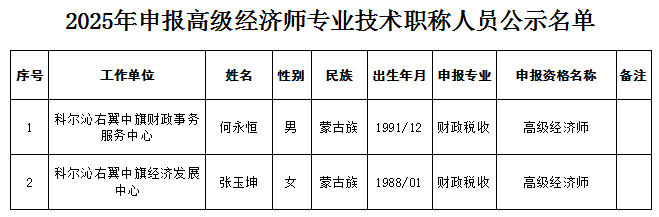 根据兴安盟人社局《关于做好2025年全盟职称评审工作的通知》(兴人社办发〔2025〕66号)、内蒙古自治区人力资源和社会保障厅《关于做好2025年度自治区高级经济师评审材料申报工作的通知》(内人社办发〔2025〕164号)文件精神,我旗2025年高级经济师职称申报工作已经结束,现将申报人员名单予以公示。