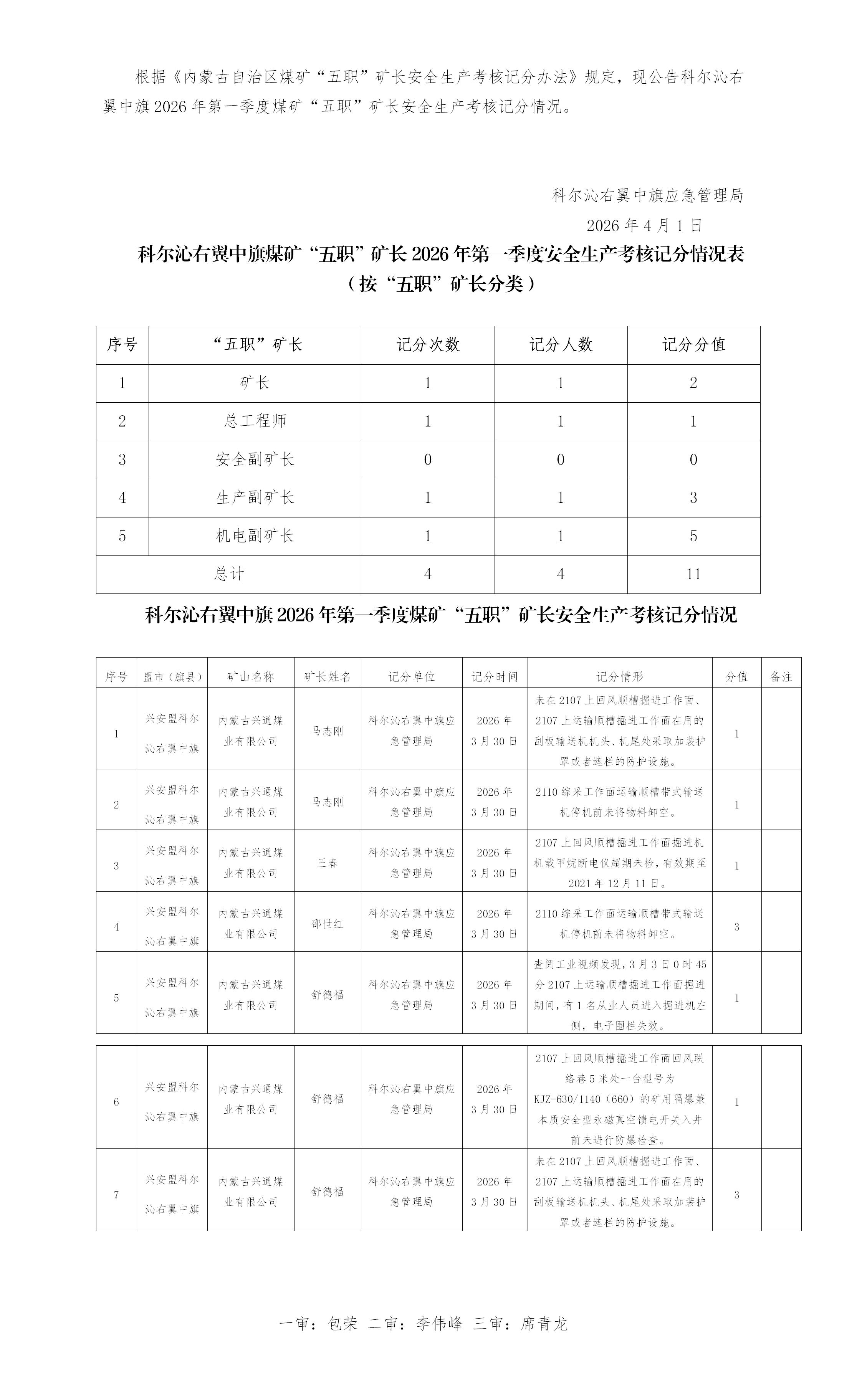 科尔沁右翼中旗煤矿“五职”矿长 2026年一季度安全生产考核记分情况的公告