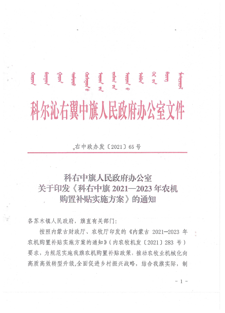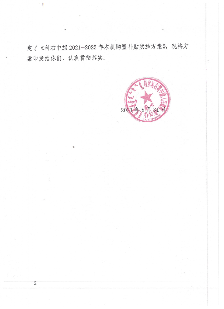 科右中旗2021—2023年农机购置补贴实施方案