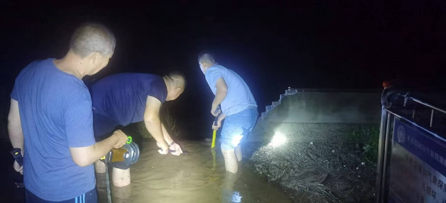 梅汛期7月4日湖北黄冈黄州处置管涌:技术人员下水查看险情