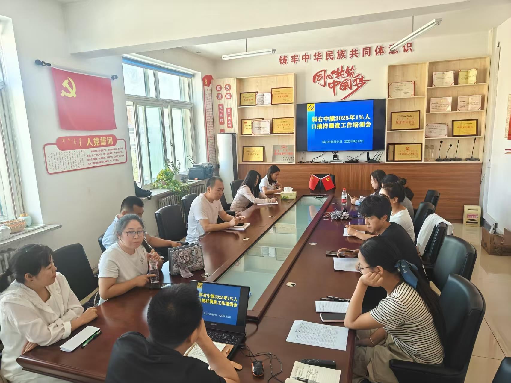为扎实有效推进科右中旗2025年全国1%人口抽样调查工作,8月12日,旗统计局组织各苏木镇统计助理参加全盟1%人口调查视频培训会并组织座谈交流,各苏木镇、党群服务中心、农牧场、工作部共14人参训。