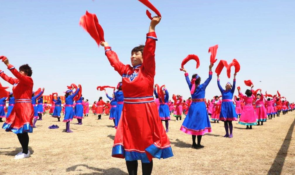 在中旗,无论是城镇还是乡村,每到晚饭后,不少男女老少就会身着民族服,自发来到文化广场、社区内或者是村边街道的空地上,伴着悠扬的乐曲,踩着欢快的节奏,手挥彩绸,激情起舞,跳起独具草原特色的“安代舞”,用欢畅的舞姿、欢乐的笑脸,淋漓尽致地展现着幸福美好的生活。
