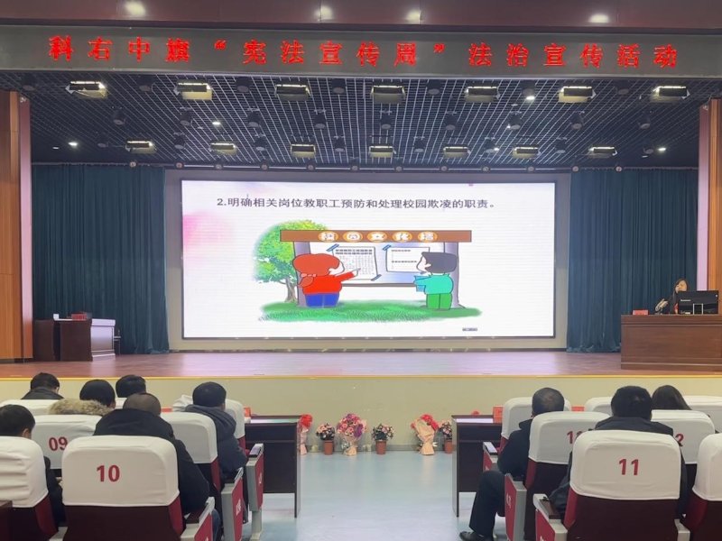 在第十个国家“宪法宣传周”来临之际,为进一步提高全旗各中小学教职工学法用法水平,防范校园欺凌事件发生,11月30日,科右中旗司法局联合旗教育局组织开展了“宪法宣传周”依法防治“校园欺凌”为主题的法治培训会。旗司法局党组成员、副局长包海峰参加活动,全旗43所学校、幼儿园安全校长、德育校长、分管食堂的副校长、政教主任、安全主任、食堂管理员等共220余人参加本次培训会。